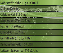 Dosierung: Ausgangswasser je nach Belieben mit Osmo Royal GH + Basic aufhärten. 10 g auf 100 l erhöhen die Gesamthärte um 3,9 °dGH. Ein gestrichener Teelöffel entspricht ungefähr 5 g. Optimale Zielwerte für die Gesamthärte betragen je nach Aquarium ca. 5-15 °dGH und für den Leitwert ca. 400 +/- 50 µS/cm.