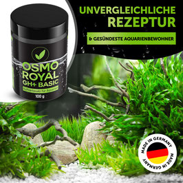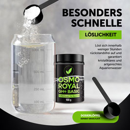 Osmo Royal GH + Basic ist ein spezielles schnell lösliches chlorid- und natriumreduziertes Aufhärtesalz zur Erhöhung der Gesamthärte. Es reichert das Wasser mit wichtigen Mineralstoffen an und dient der Remineralisierung von Osmosewasser. Osmo Royal GH + Basic hebt die Gesamthärte (GH) an und sorgt für ein naturnahes Wasser und fördert den Pflanzenwuchs und das Wohlbefinden der Aquarienbewohner. Osmo Royal GH+ Basic besitzt ein für das Pflanzenwachstum ideales Calcium-Magnesium-Verhältnis von 2:1. Durch die chlorid- und natriumreduzierte Rezeptur kommt es selbst extrem hohen Dosen nicht zu kritischen Chlorid- und Natriumwerten und damit auch zu keiner Hemmung des Pflanzenwachstums durch zu hohe Chlorid- oder Natriumwerte. Osmo Royal GH + Basic enthält kein Kalium, wodurch ein zu hoher Anstieg des Kaliumgehaltes im Aquarium verhindert wird.